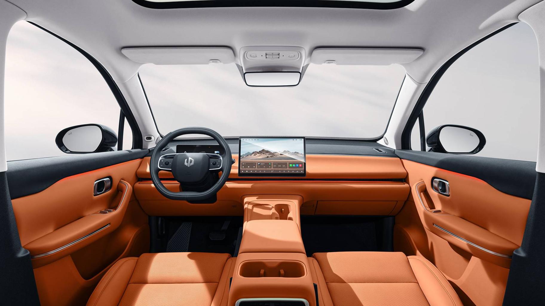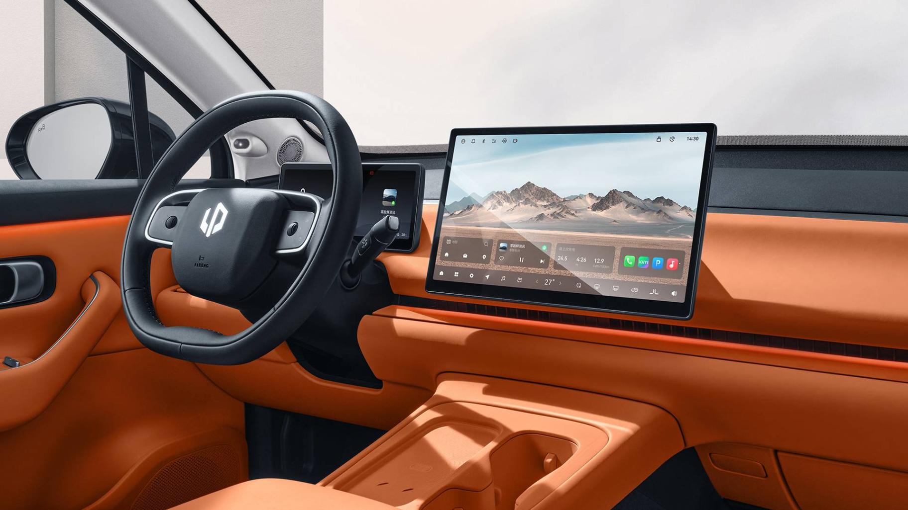 14.6英寸中控屏和10.25英寸全液晶儀表,零跑C10的內飾設計整潔清爽。除了側窗和遮陽簾,整個內飾找不到任何實體按鍵。橋式中控臺方便儲物,上方配有杯架和手機無線充電板。