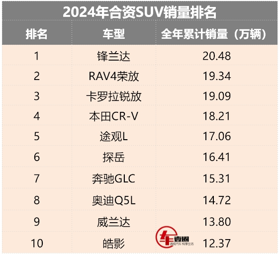伴隨著2024年的結(jié)束,一些車型全年銷量數(shù)據(jù)也新鮮出爐。盡管在過去的一年車市比較內(nèi)卷,不過合資SUV的整體表現(xiàn)仍值得關(guān)注。其中日系SUV鋒蘭達(dá)、RAV4榮放、卡羅拉銳放、CR-V銷量排名靠前,德系SUV成中流砥柱。而在豪車SUV中,奔馳GLC的銷量一馬當(dāng)先。