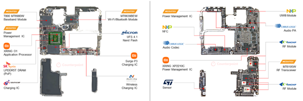 值得一提的是,電源管理芯片采用了聯發科和小米自研的雙重方案,其中聯發科提供通用電源管理IC,小米自研的XRING XP2210C專門負責電源管理優化(充電IC則來自小米自家的Surge P3芯片)。