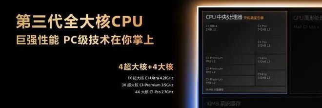 天璣 9500 相較前代天璣 9400 實現了顯著升級:聯發科宣稱其單核性能提升 32%,峰值功耗降低 37%。延續天璣 9400 的 “全性能核心” 架構,新款芯片雖未采用自研架構,但依托 ARM 最新 C1 核心維持 8 核配置,具體規格如下: