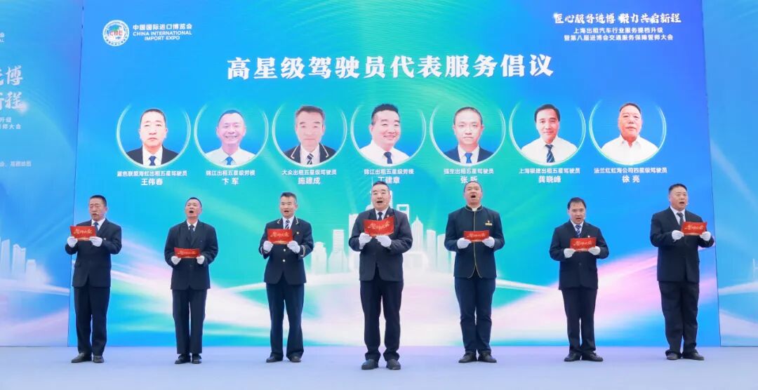 誓師大會(huì)上,“全國(guó)五一勞動(dòng)獎(jiǎng)?wù)?rdquo;獲得者、“上海市勞動(dòng)模范”、五星級(jí)出租車駕駛員丁建章與來(lái)自強(qiáng)生、錦江、大眾、銀建、藍(lán)色聯(lián)盟、法蘭紅聯(lián)盟等運(yùn)營(yíng)保障單位的7名高星級(jí)駕駛員代表發(fā)出鏗鏘有力的倡議,承諾將全力保障第八屆進(jìn)博會(huì)出租出行。