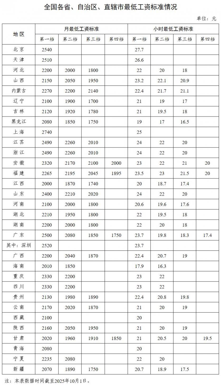 近日,人力資源和社會保障部網站公布全國各省、自治區、直轄市最低工資標準情況(截至2025年10月1日)。從月最低工資標準看,上海以2740元的標準居全國首位;從小時最低工資標準看,北京以27.7元的標準為全國最高。