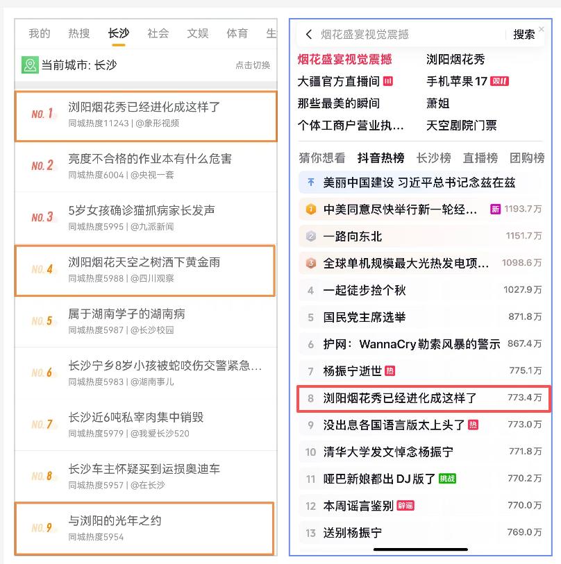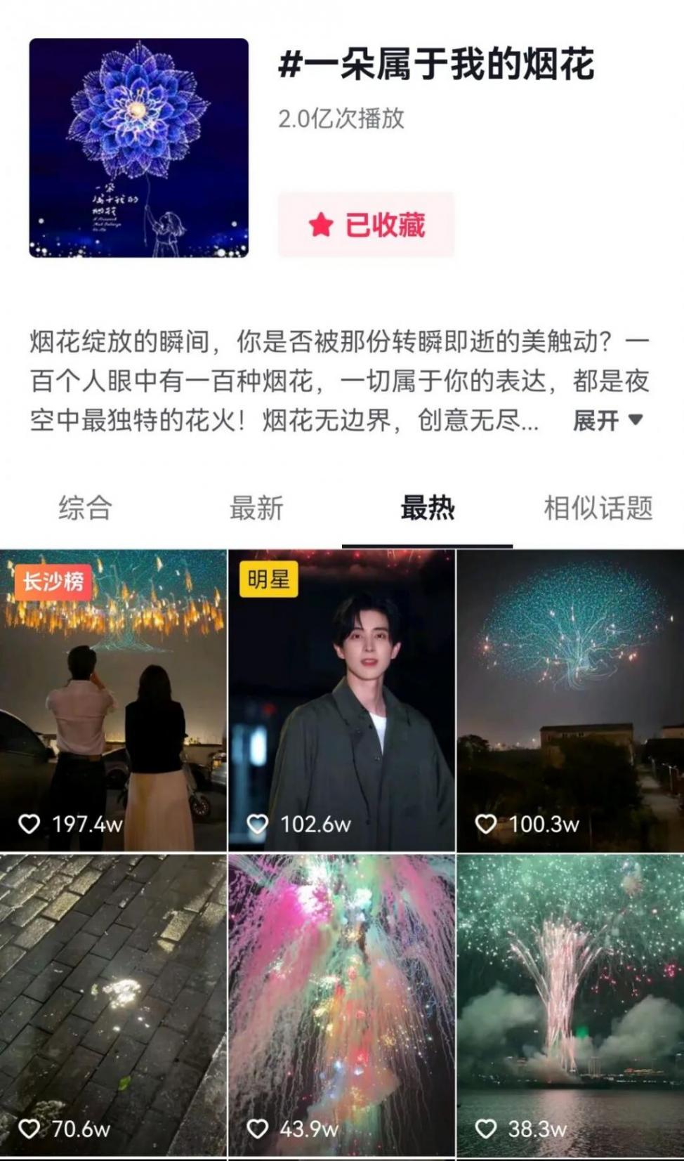 截至今日(10月19日)9時,話題《瀏陽煙花秀已經進化成這樣了》沖上全國熱榜,在抖音、微博、小紅書、快手等網絡平臺上刷屏,總關注量超3億次,其中話題“一朵屬于我的煙花”單抖音平臺已經達2億次播放。