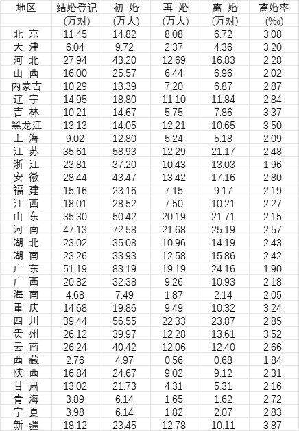 根據(jù)《中國統(tǒng)計年鑒2025》,去年結婚登記人數(shù)前十的省份分別是廣東、河南、四川、江蘇、山東、安徽、河北、云南、貴州和浙江。