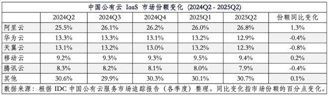 10月31日,IDC發(fā)布最新的《中國公有云服務(wù)市場(2025上半年)跟蹤》報(bào)告。報(bào)告顯示,2025年第二季度,阿里云在中國公有云基礎(chǔ)設(shè)施即服務(wù)(IaaS)市場的份額攀升至26.8%,連續(xù)五個(gè)季度份額上漲。